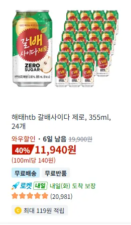 쿠팡갈배사이다 제로 355ml 24캔 (와우회원 한정)11,940원핫딜모음핫딜모음에서 제공한 가격