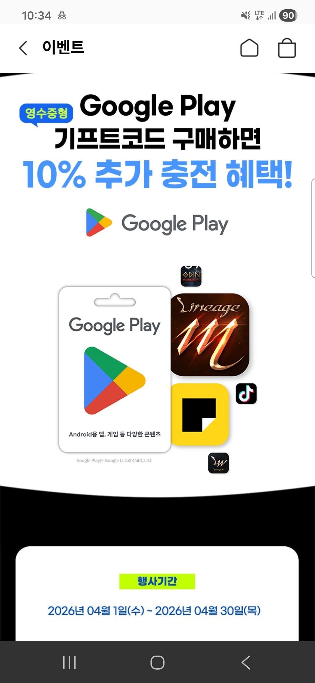 | 티몬(TMON) | Google Play 기프트코드 | 선착순 5%~10% 할인 | 특가 딜 이벤트로 저렴하게 구매 가능, 선착순 |