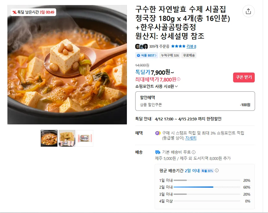 📦 구수한 자연발효 수제 시골집 청국장 180g x 4개+한우사골곰탕증정