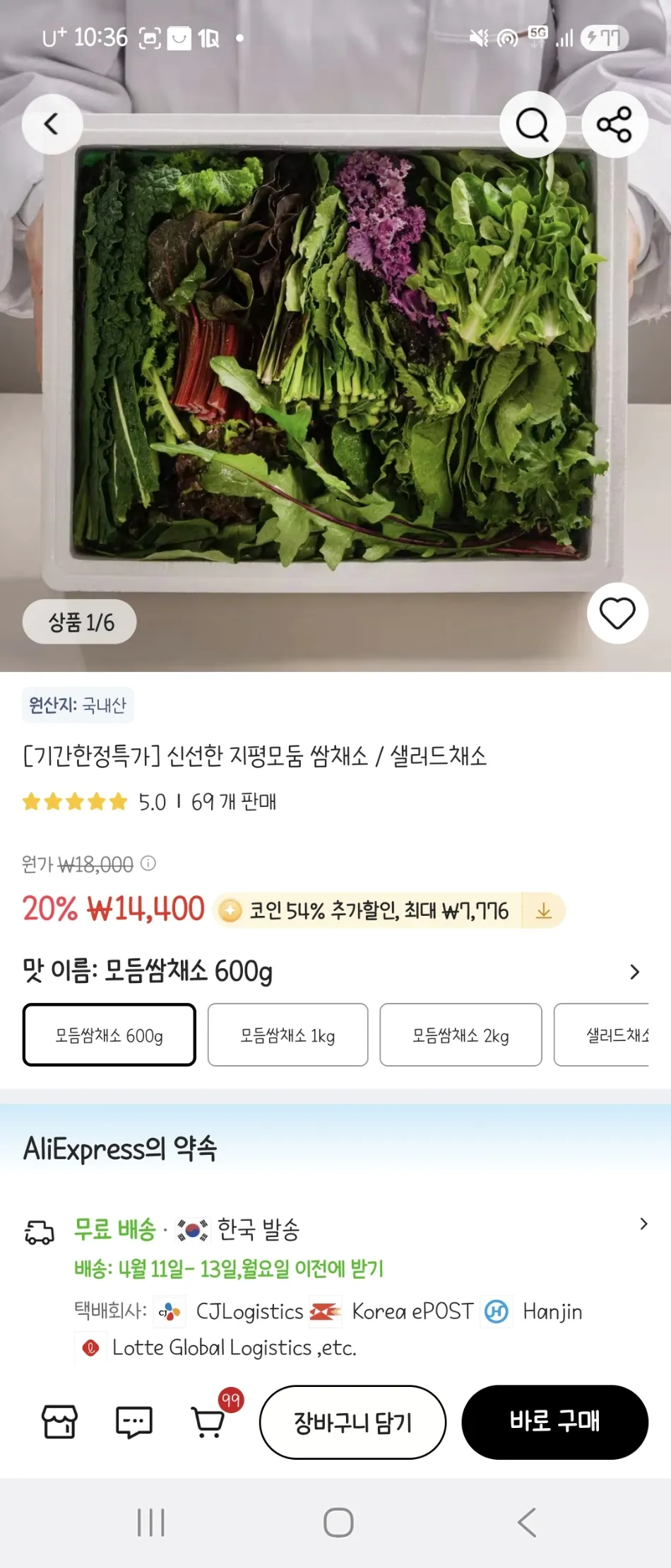 | 알리 | [기간한정특가] 신선한 지평모둠 쌈채소 / 샐러드채소 (코인딜 54%) | 6,624원 | 핫딜모음에서 제공한 가격 |