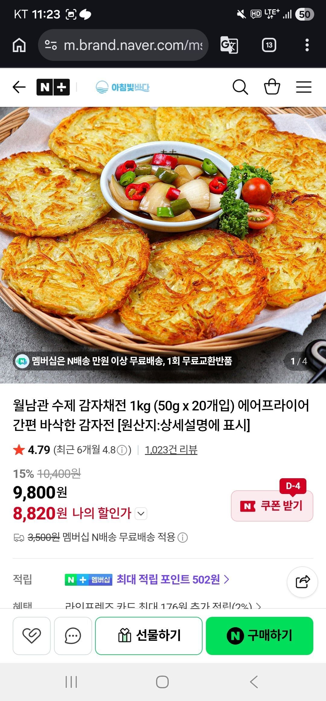 | 네이버쇼핑 | 네멤) 월남관 수제 감자채전 1kg (50g x 20개입) 에어프라이어 간편 바삭한 감자전 | 7,930원 | 핫딜모음에서 제공한 가격 |