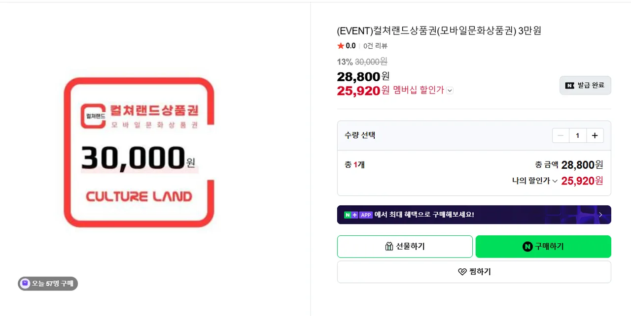 📦 네멤) 컬쳐랜드상품권(모바일문화상품권) 3만원 13% 할인
