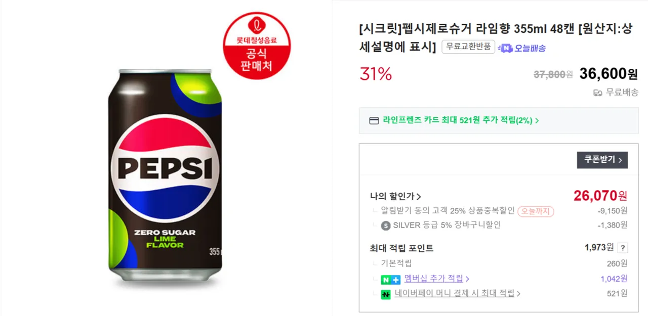 롯데ON꼭필스 펩시콜라 제로 라임향 355ML 48캔55,380원정상가 58,680원에서 5% 할인