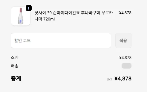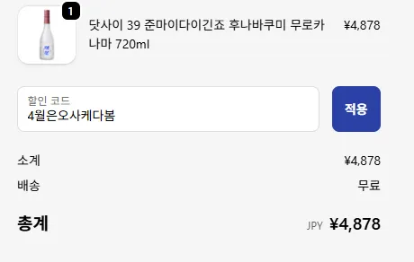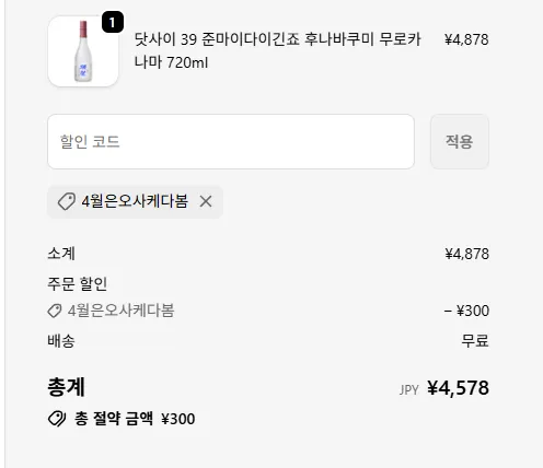 결제창에서 보이는 쿠폰입력에 '4월은오사케다봄' 입력 후 적용시 300엔 추가할인