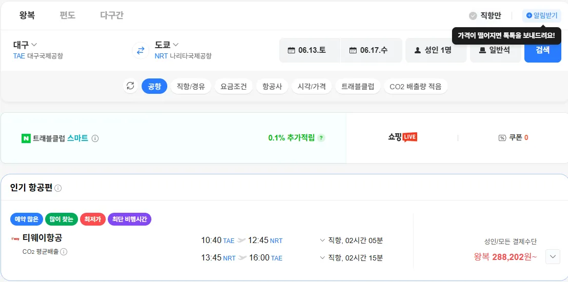 | 트립닷컴 | 대구-나리타 0613-0617 | 215,300원 | 6월 기준 최저가 추정 |