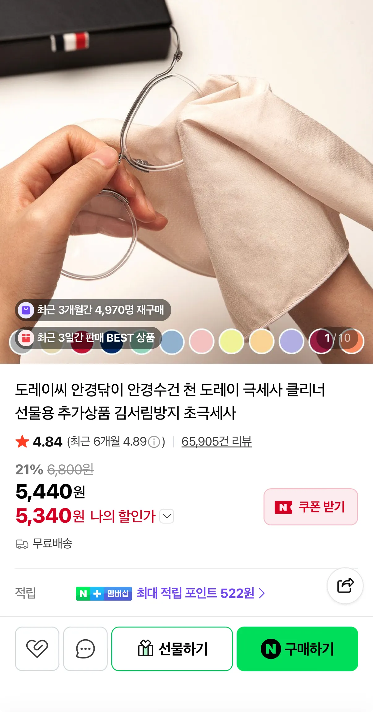 | 쿠팡 | 도레이씨 안경클리너 안경닦이 19x19cm | 9,200원 | 단품 가격, 타이크로 미포함 |