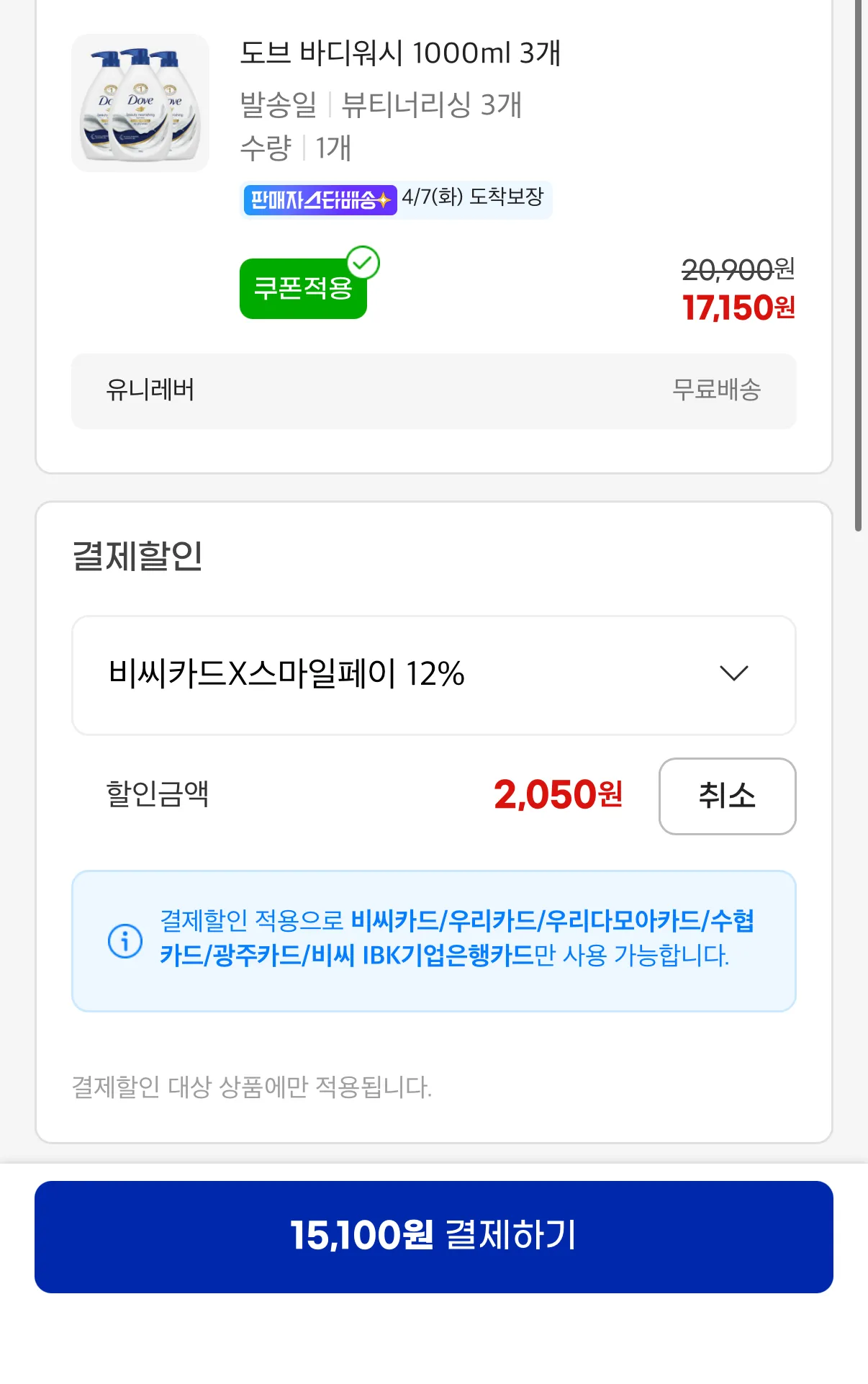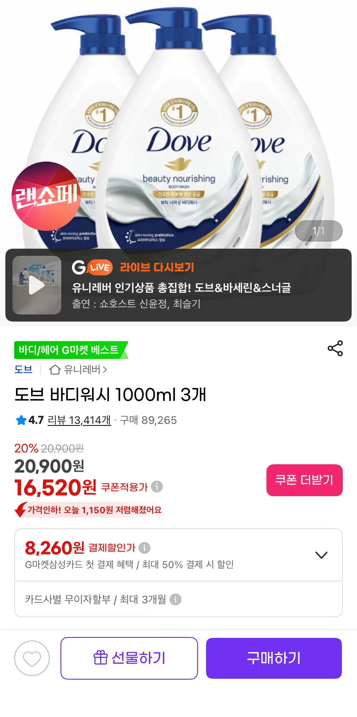 📦 도브 바디워시 1L x 3개