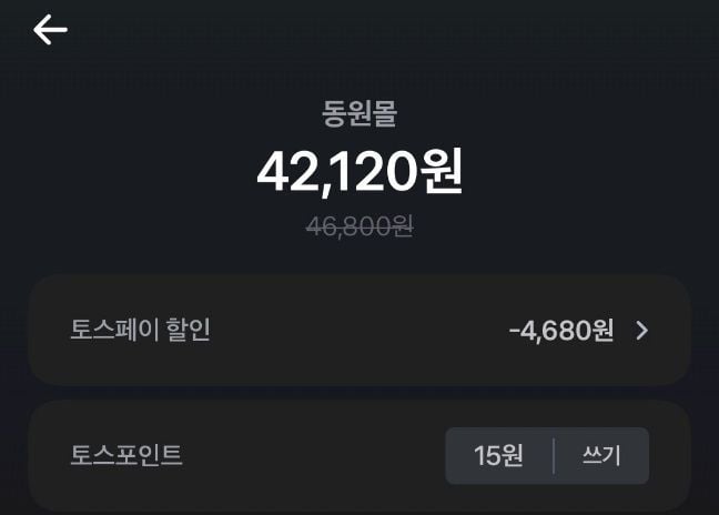 토스 10% 할인받으면 46800원->42120원