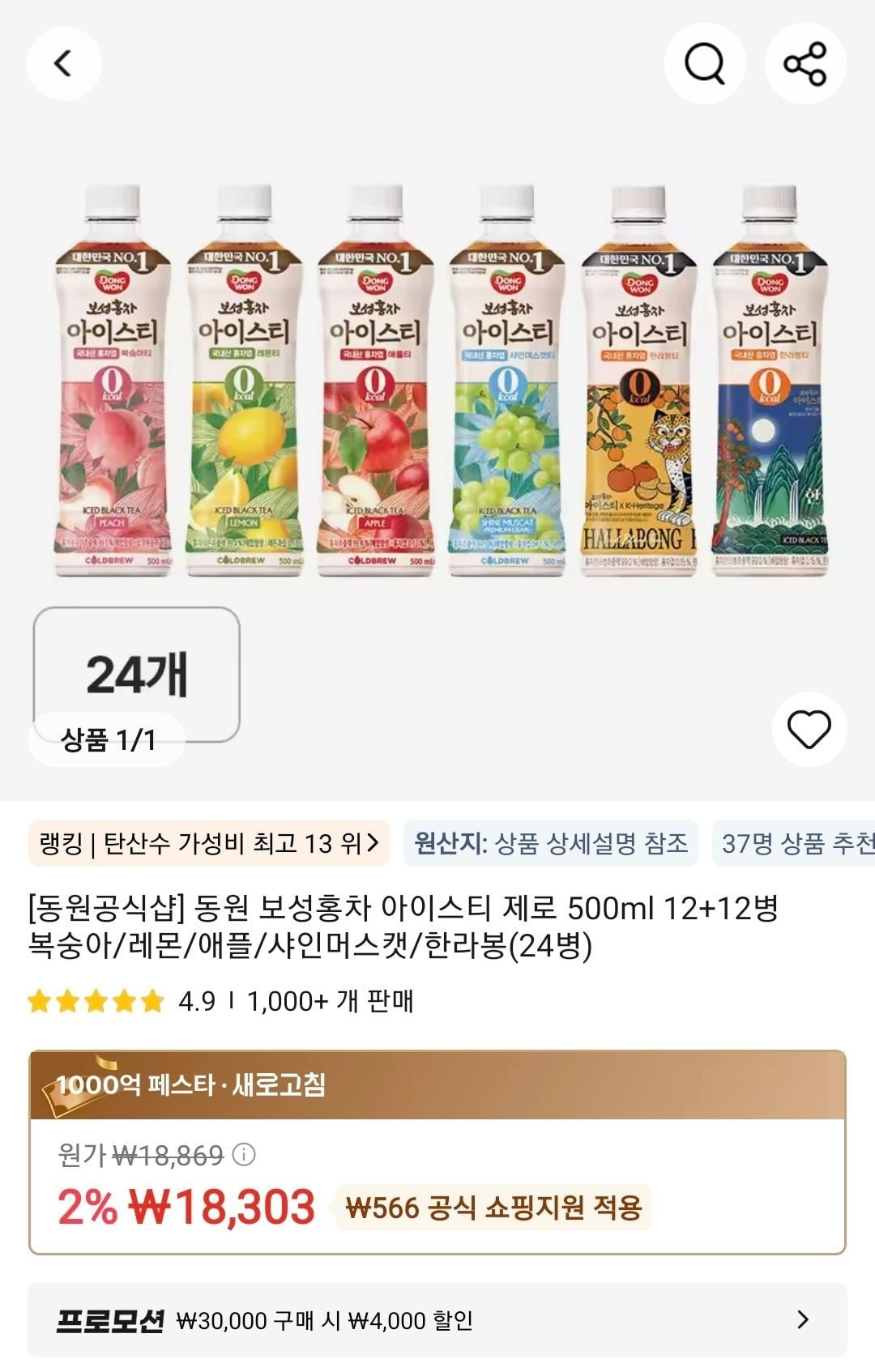 | 알리 | 동원 보성홍차 아이스티 제로 5종 택 2종 500ml 24병 | 16,803원 | 핫딜모음에서 제공한 가격 |