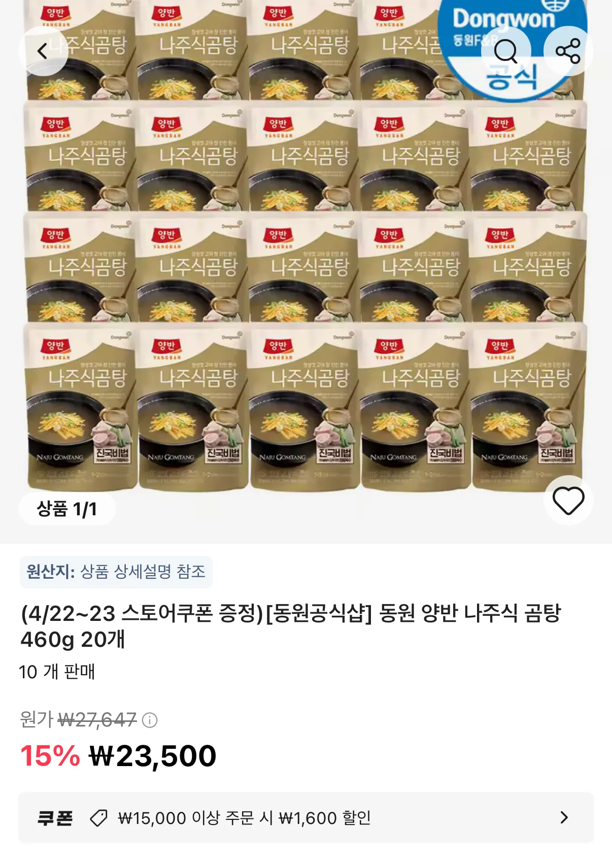 | G마켓 | 동원F&B 양반 나주식 곰탕 460g (20개) | 24,620원 | 다나와 최저가 기준 |
