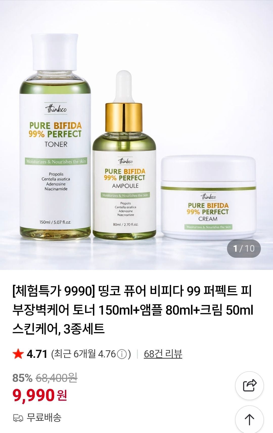 | 네이버 | 띵코 퓨어 비피다 99 퍼펙트 토너 150ml+앰플 80ml+크림 50ml 3종세트 | 9,990원 | 핫딜모음에서 제공한 가격 |