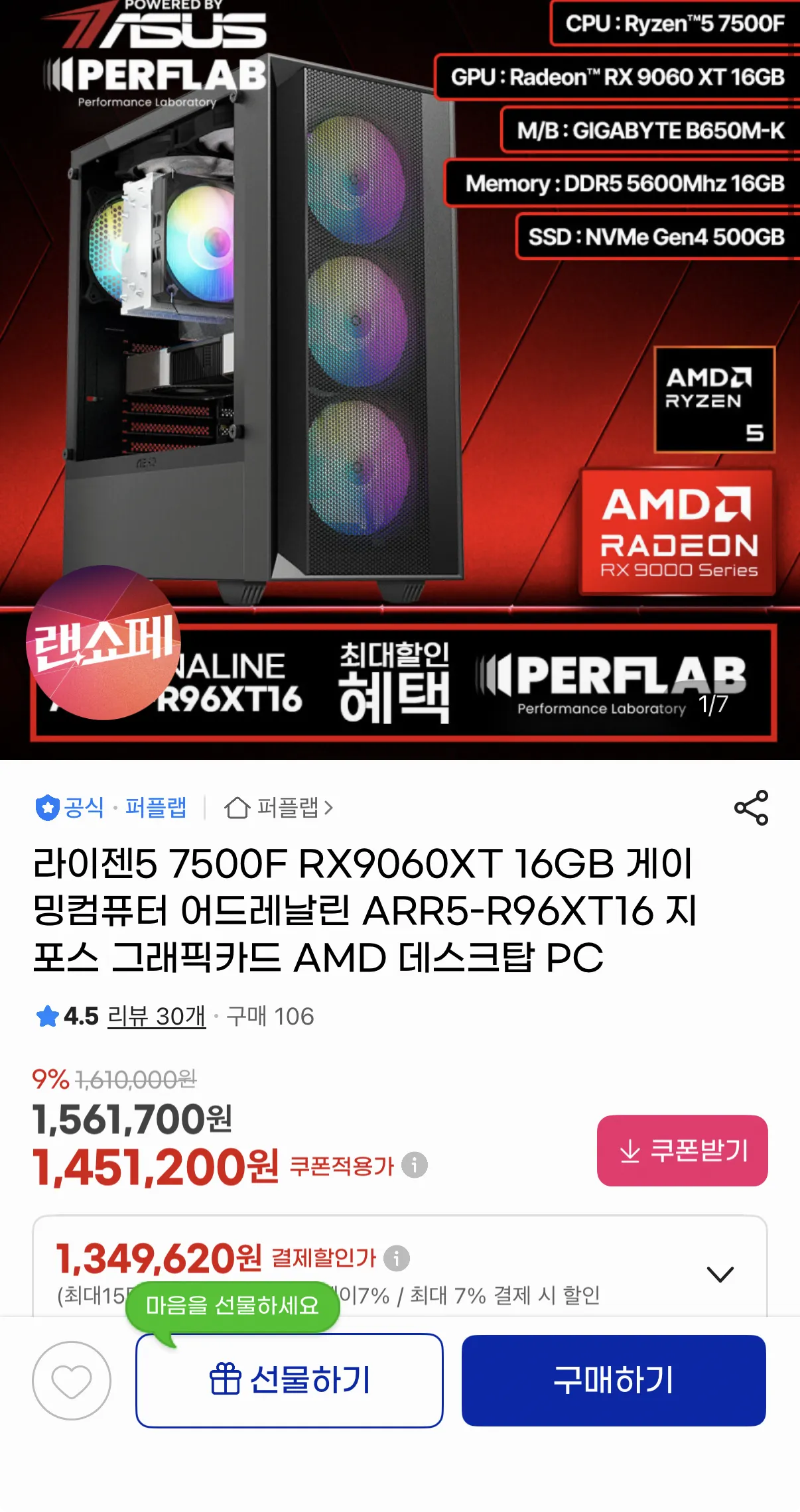 | 하이마트 | 7500F + 9060XT VRAM 16GB + DDR5 32GB + 1TB 완본체 | 1,745,480원 | QHD 게이밍 완본체 |