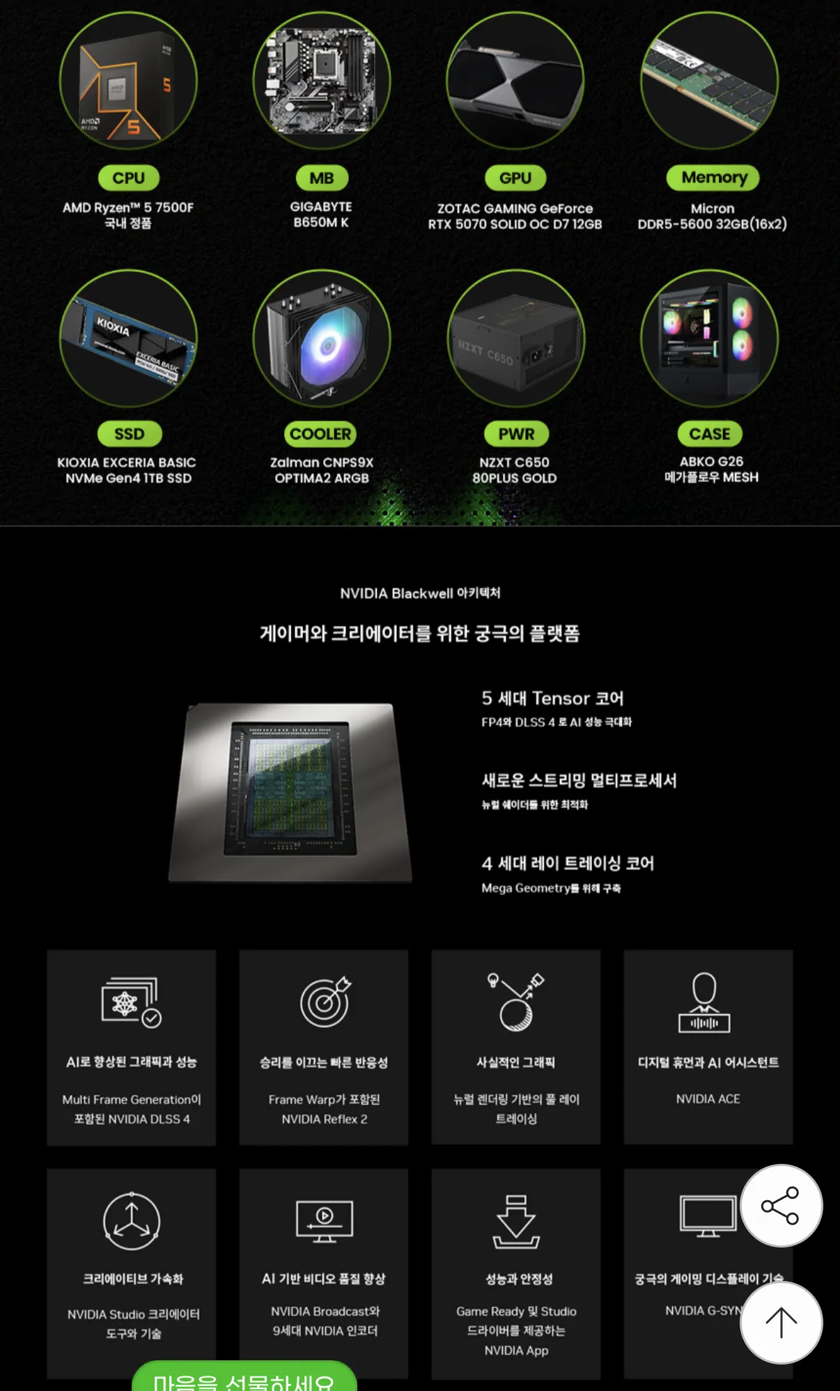 | 알리익스프레스 | 피씨스토어 AMD 게이밍PC 라이젠5 7500F RTX5070Ti (32GB, M.2 1TB) | 2,790,356원 | RTX5070Ti 사양, 비슷한 고사양 |
