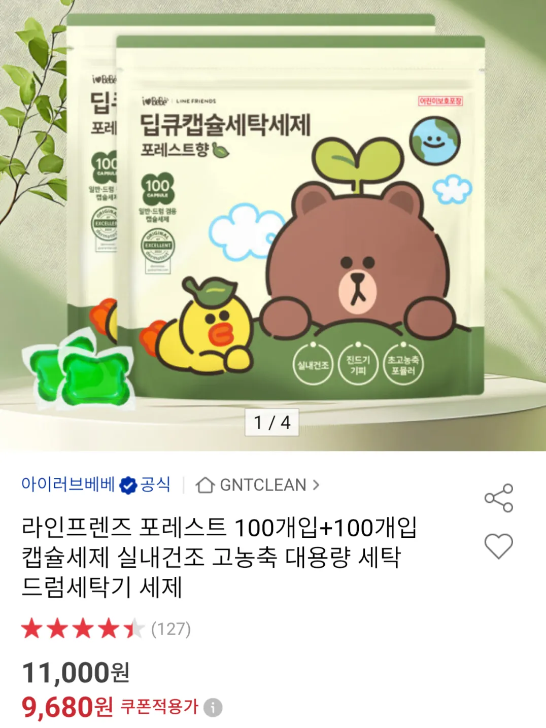 | 11번가 | 아이러브베베 라인프렌즈 캡슐세제 100개입+100개입 포레스트향 | 19,850원 | 200개입相当 |