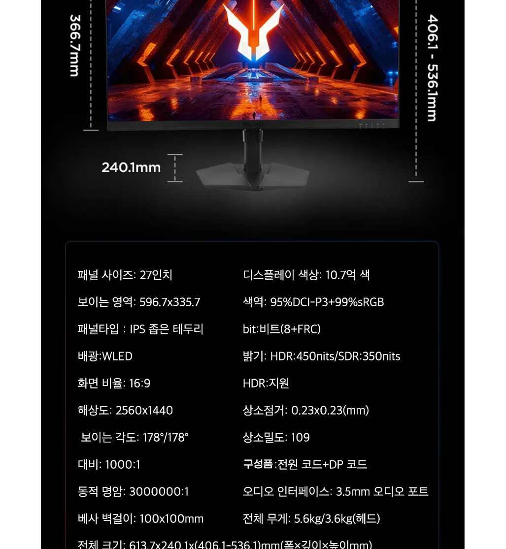 QHD,27인치,IPS,200HZ, HDR기준 450 SDR기준 350nits