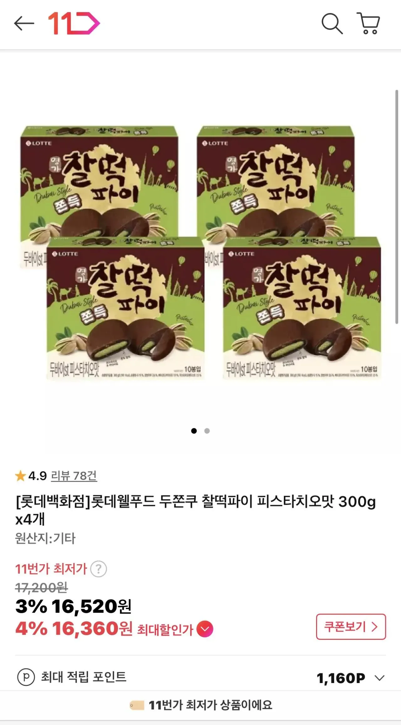 | 11번가 | 롯데웰푸드 두쫀쿠 찰떡파이 피스타치오맛 300g 4개 | 16,520원 | 핫딜모음에서 제공한 가격 |