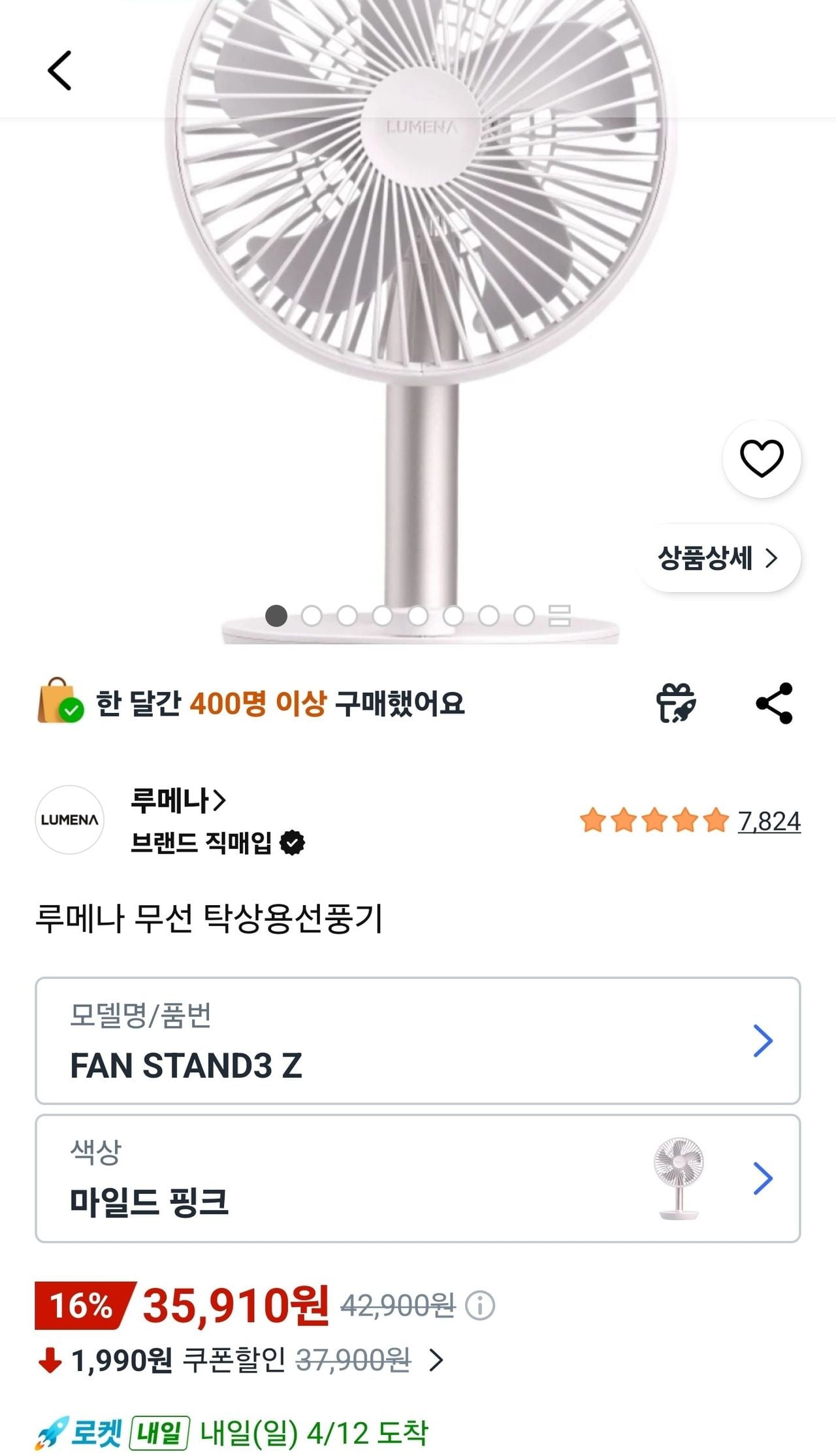 | 쿠팡 | 루메나 무선 탁상용 선풍기 FAN STAND3Z | 35,910원 | 핫딜모음에서 제공한 가격 |