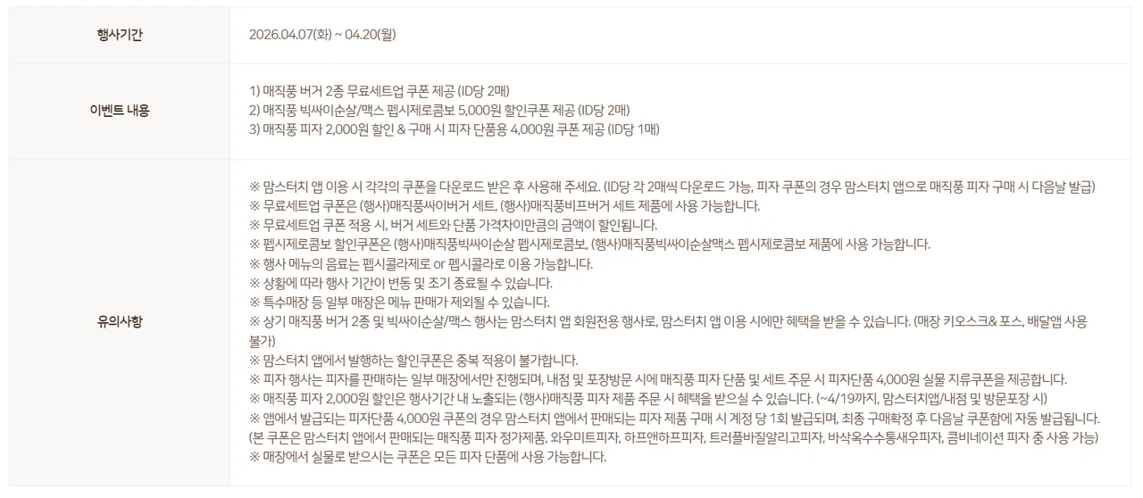 매직풍 버거 2종 무료세트업