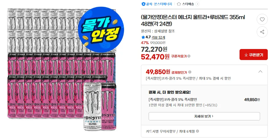 | G마켓 | 몬스터 에너지 울트라+루비레드 355ml 48캔(각 24캔) | 49,850원 | 핫딜모음에서 제공한 가격 |