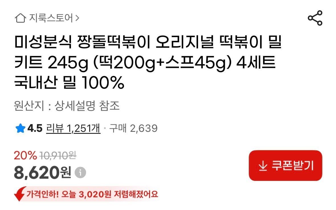 | jirum-alarm (카카오) | 미성분식 우리밀 100% 짱돌떡볶이 4세트 | 10,900원 | 선착순 쿠폰 1,000원 적용 가능 |