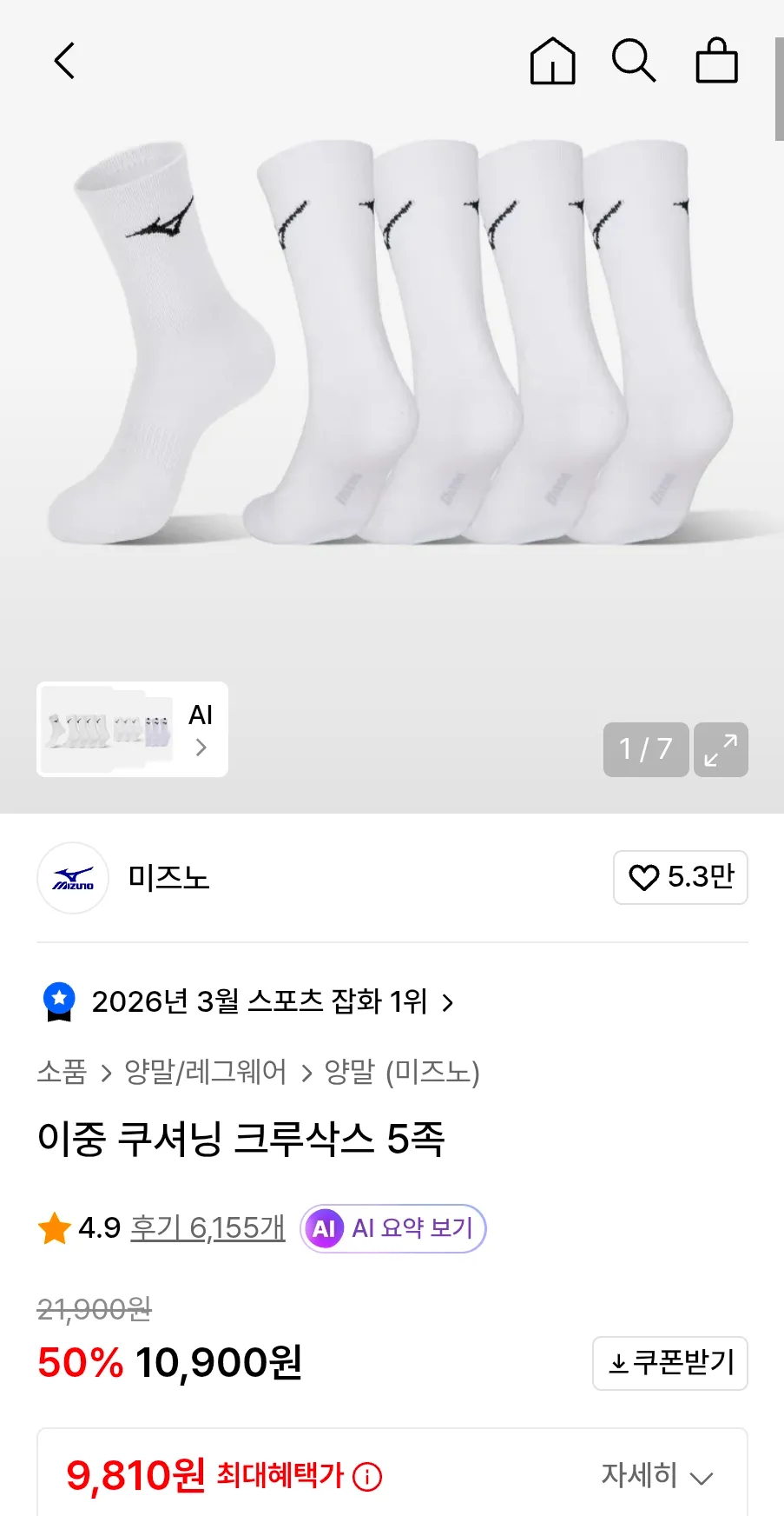 📦 미즈노 이중 쿠셔닝 크루삭스 5족