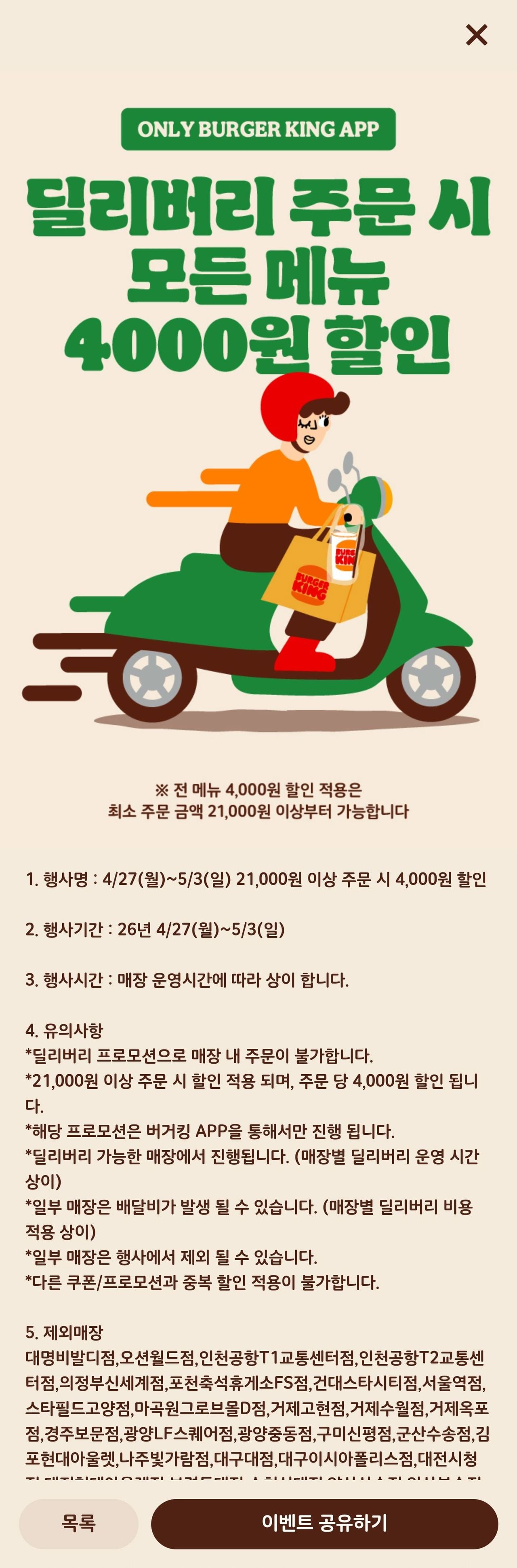 버거킹) 딜리버리 주문시 모든메뉴 4천원 할인