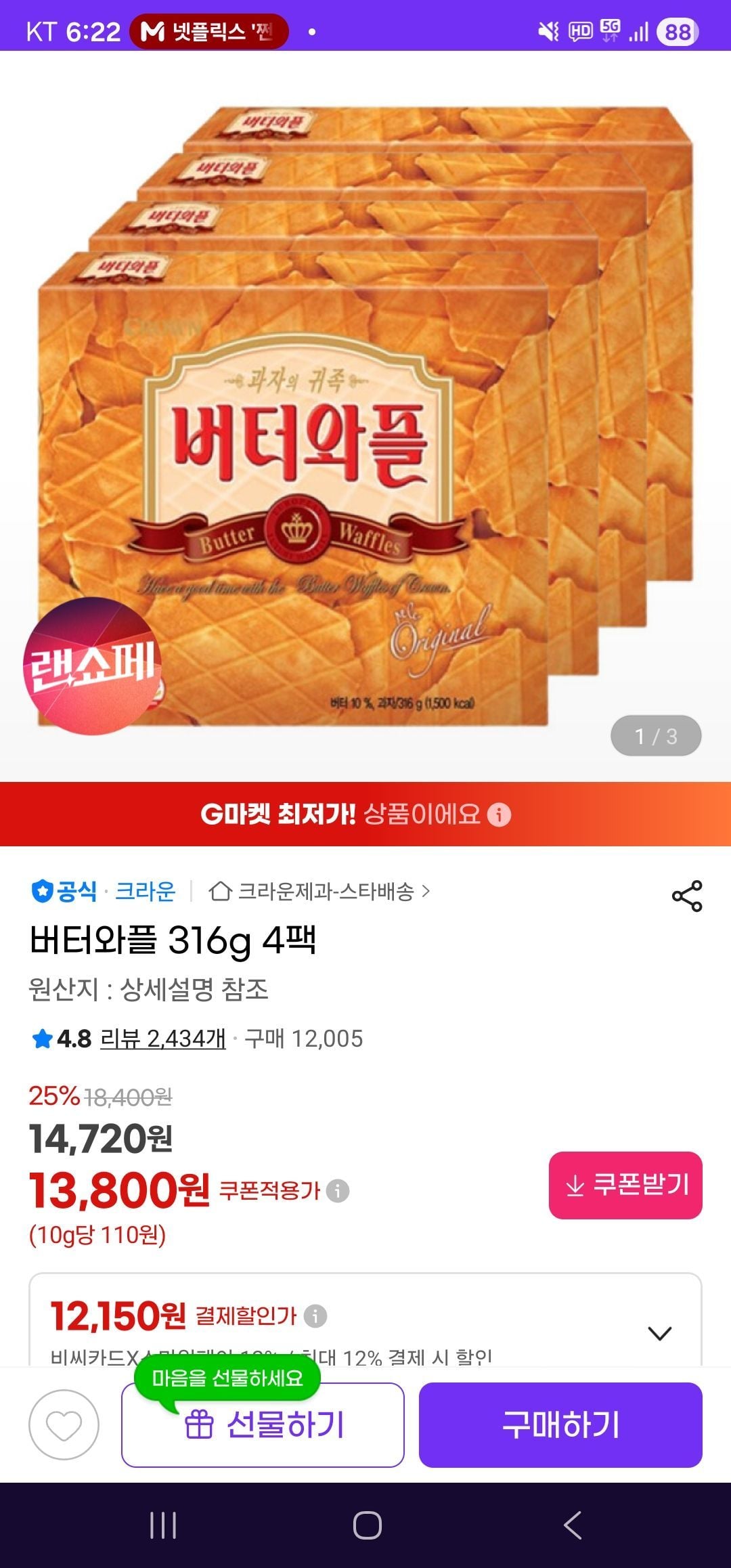 크라운 버터와플 316g 6개