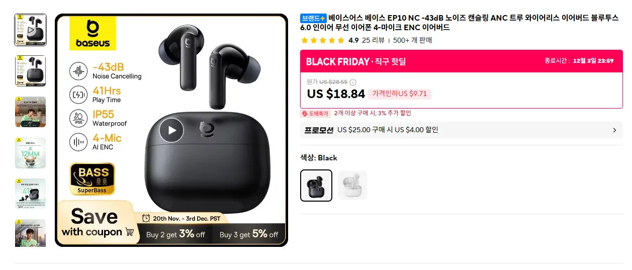 | 다이렉트웨이 | 베이스어스 Baseus EP10 Pro ANC 무선이어폰 | 약 33,674원 | 유사 모델 EP10 Pro ANC, 한국 무료배송 |