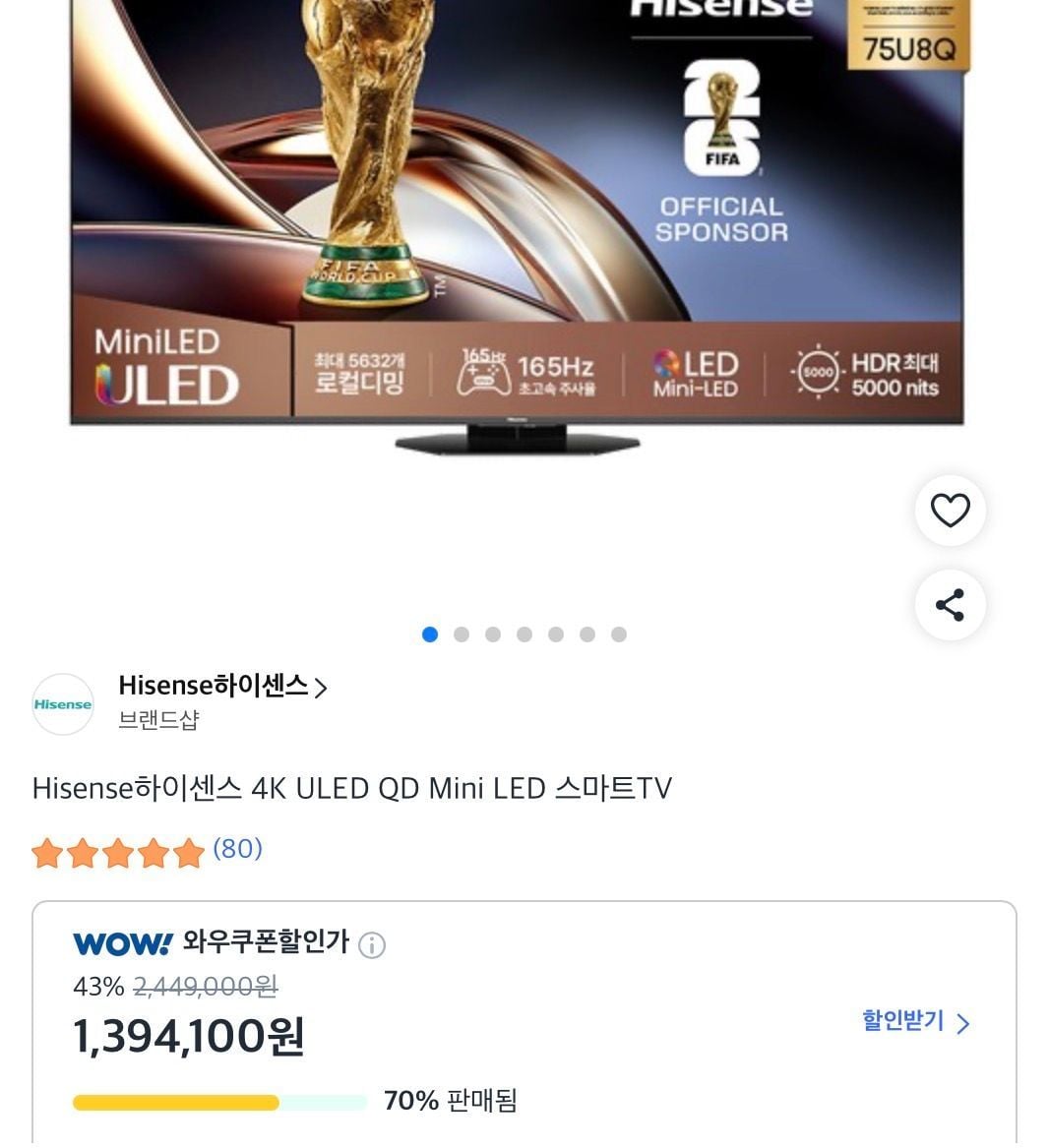 | 쿠팡와우 | 벽걸이 Hisense 하이센스 4K ULED QD Mini LED 스마트TV | 1,394,100원 | 핫딜모음에서 제공한 가격 |