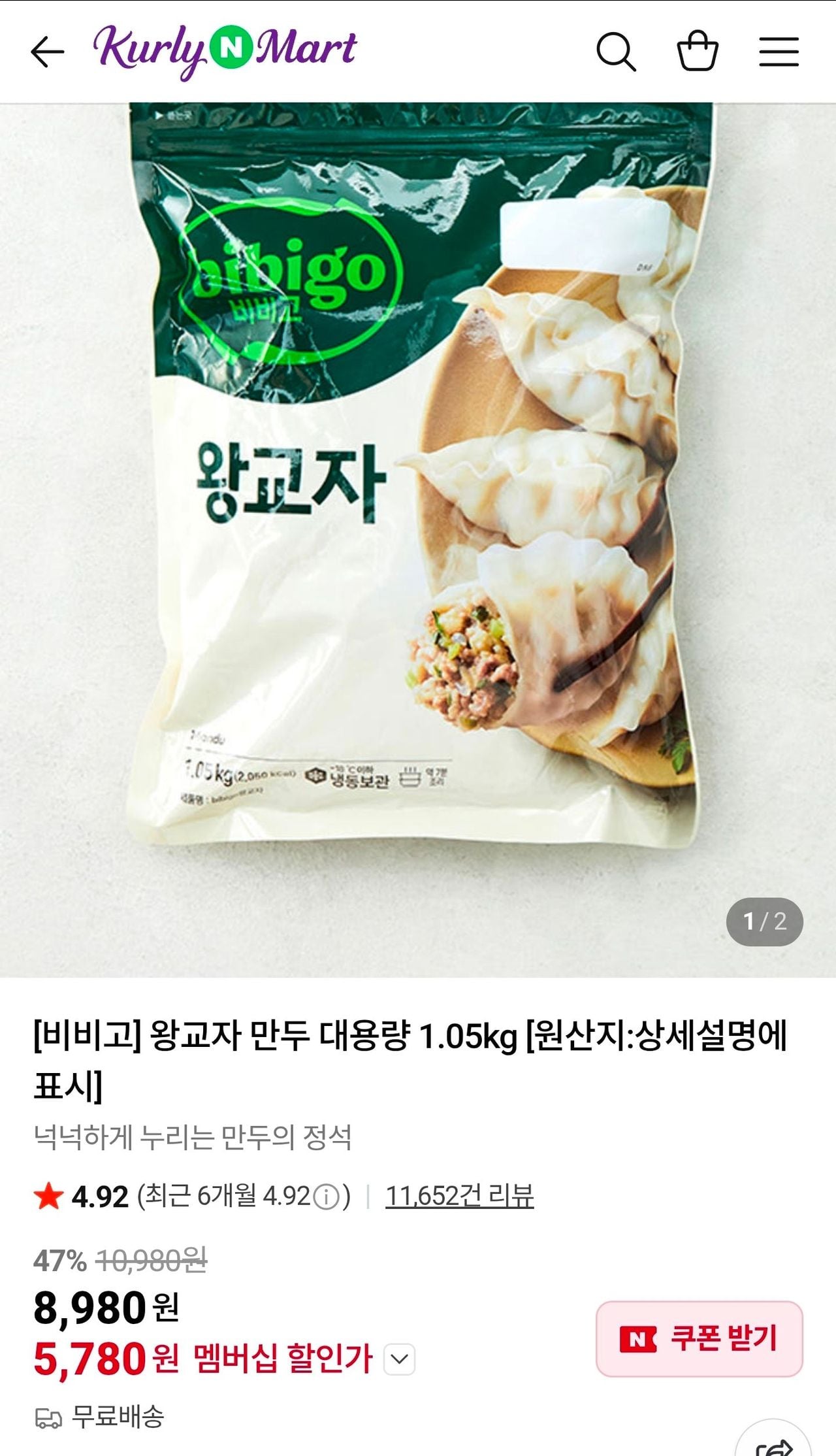 | 컬리 | 비비고 왕교자 만두 대용량 1.05kg | 가격 정보 없음 | 샛별배송 가능 (수도권/충청 내일 아침 7시 전 도착) |