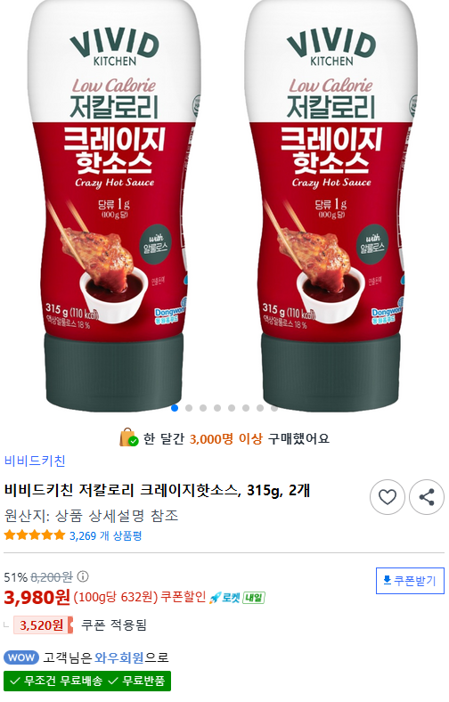 쿠팡비비드키친 저칼로리 크레이지핫소스, 315g, 2개3,980원핫딜모음핫딜모음에서 제공한 가격
