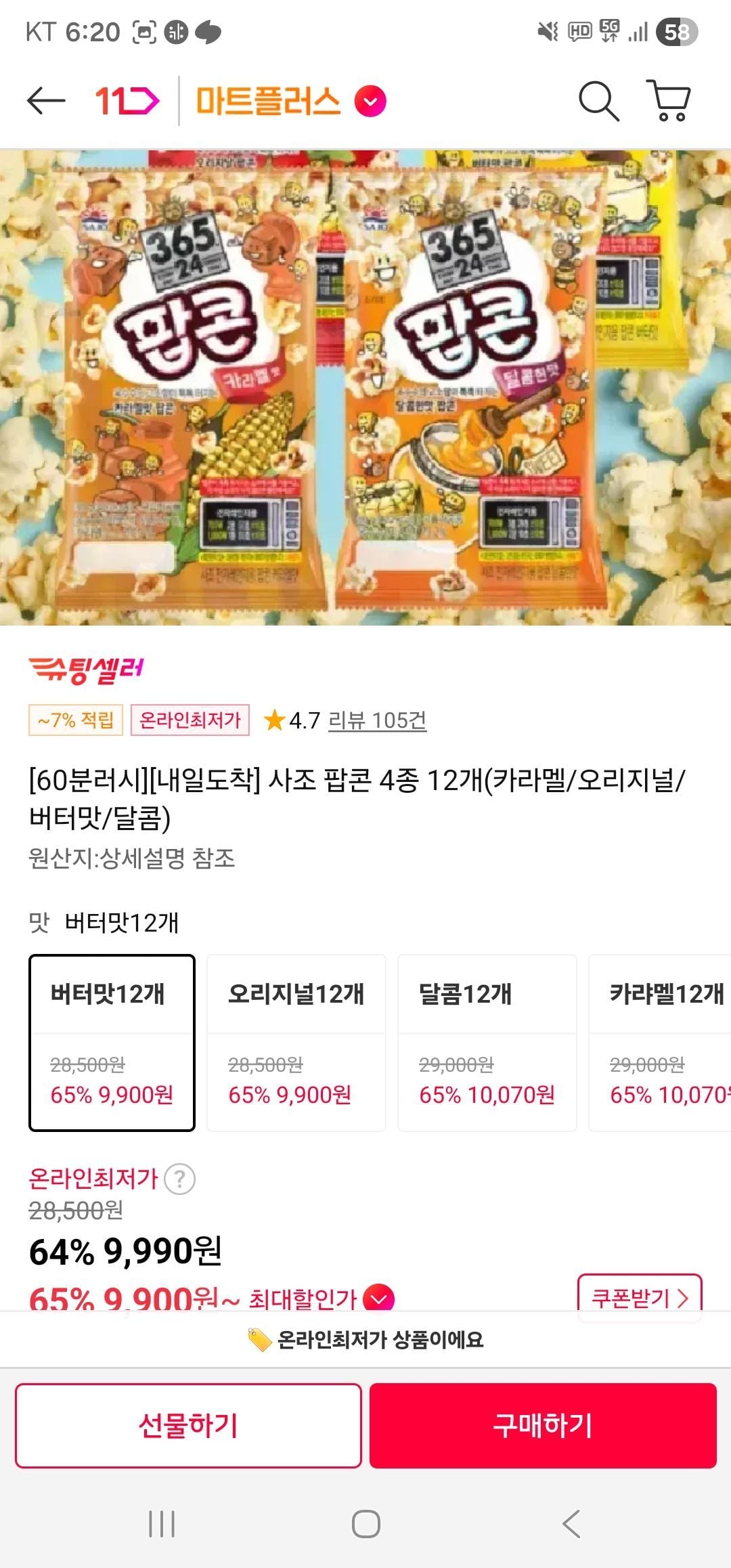11번가 9,900원이 최저가로 가장 추천, 마켓컬리 다음으로 저렴함