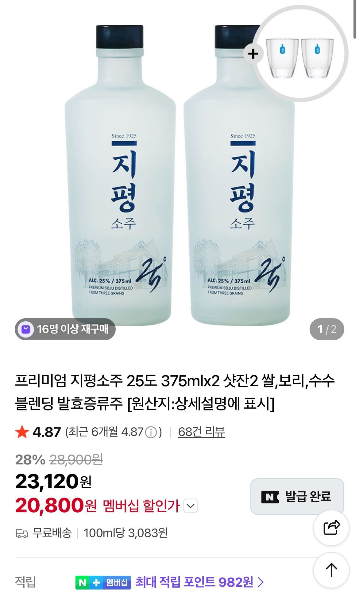 | 술마켓 | 프리미엄 지평소주 25도 375ml x2 + 샷잔2 | 24,660원 | 지평소주 포함 세트, 쿠폰 적용가 |