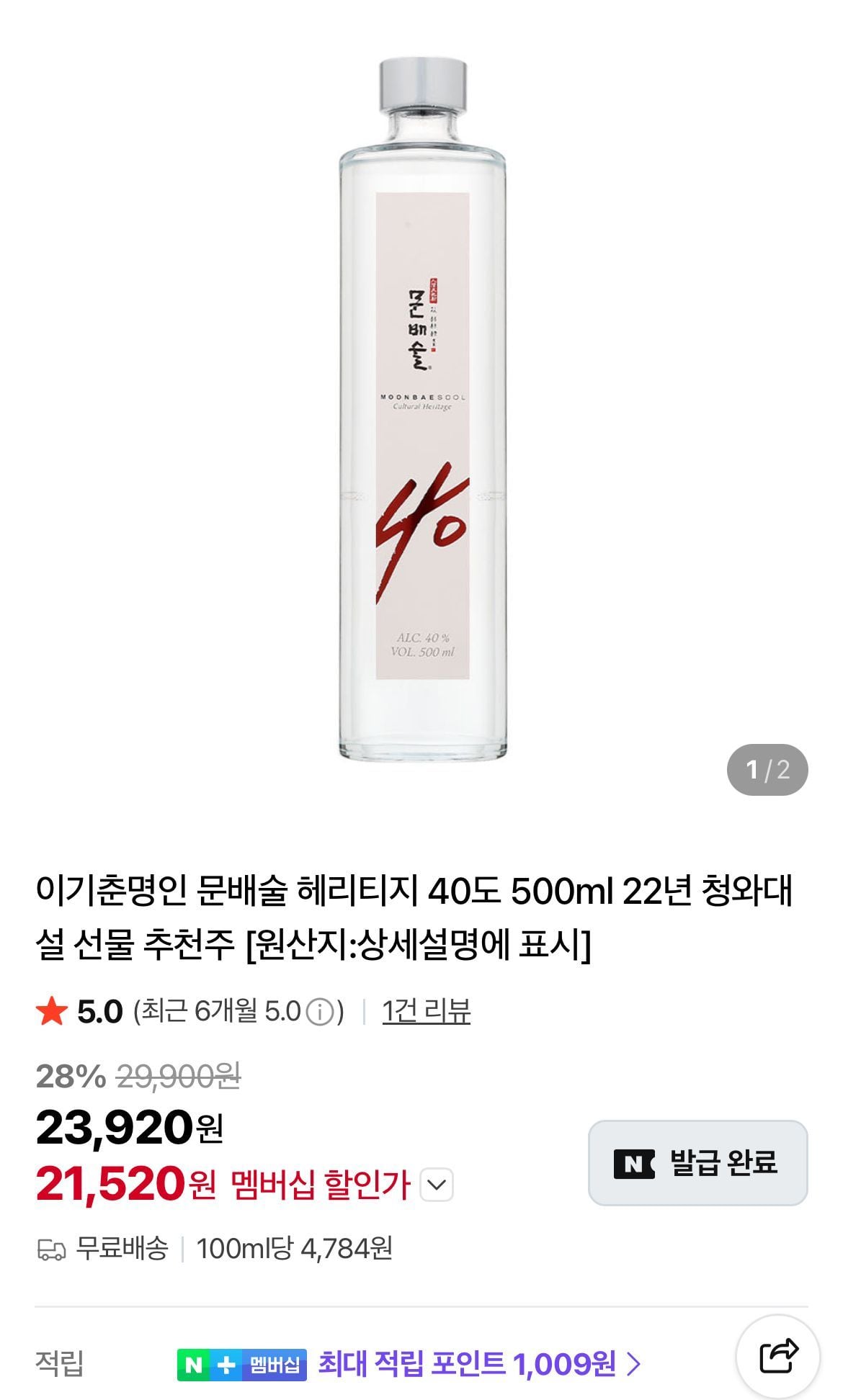 문배술 헤리티지 40도 500ml (21,520,무배)