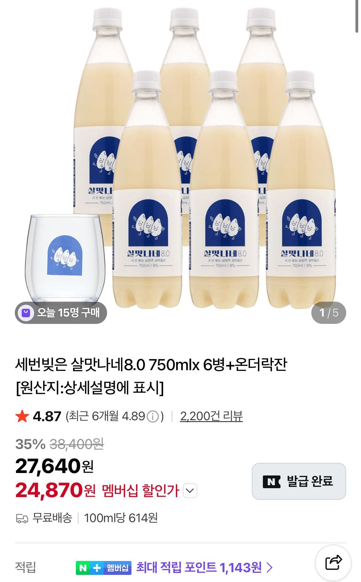 세번빚은 살맛나네8.0 750mlx 6병+살맛나네전용잔