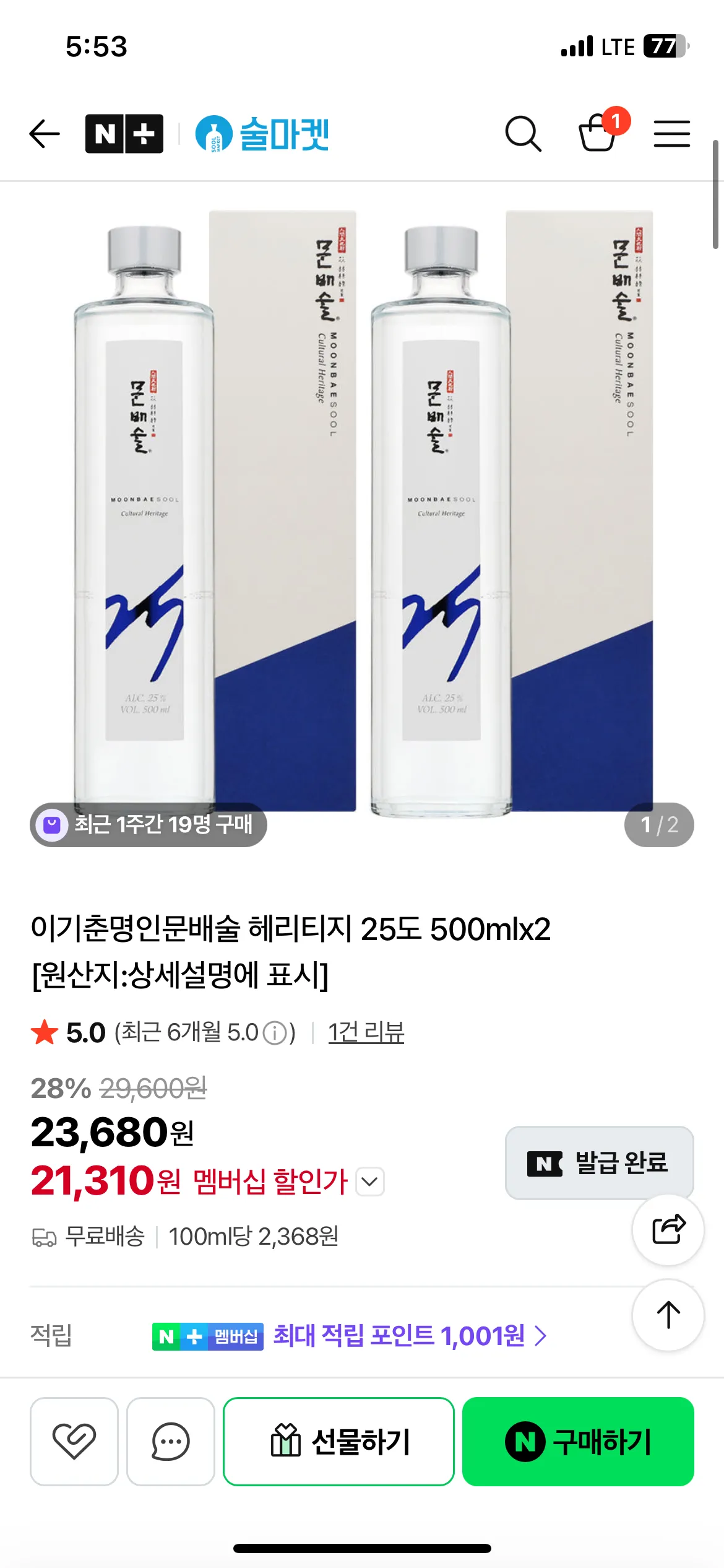 문배술 헤리티지 25도 500mlx2 (21,310, 무배)