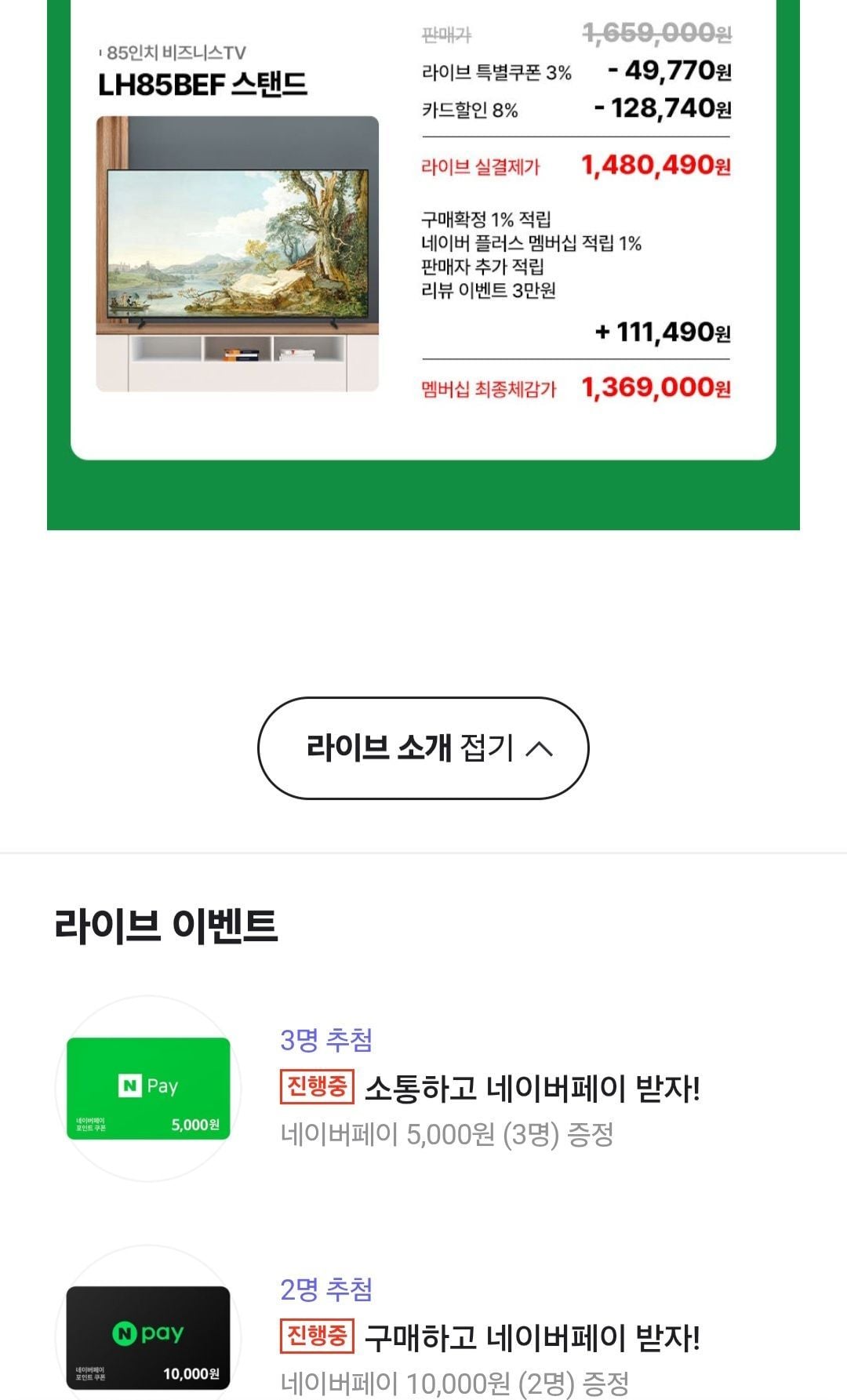 네이버페이 적립이랑 포토리뷰 합하면 체감가 136.9만 삼성 티비 85인치 크기랑 브랜드 AS 따지면 살만한듯