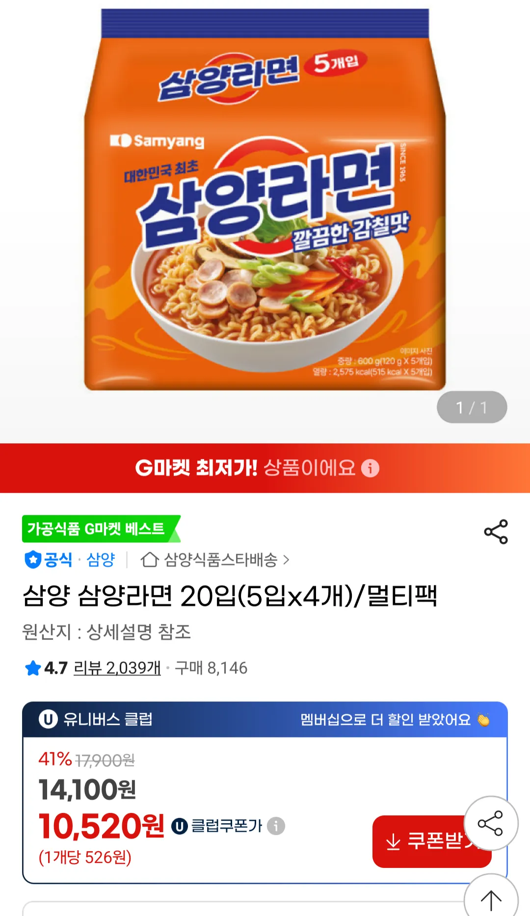 📦 삼양 삼양라면 20입(5입x4개) 유니버스클럽