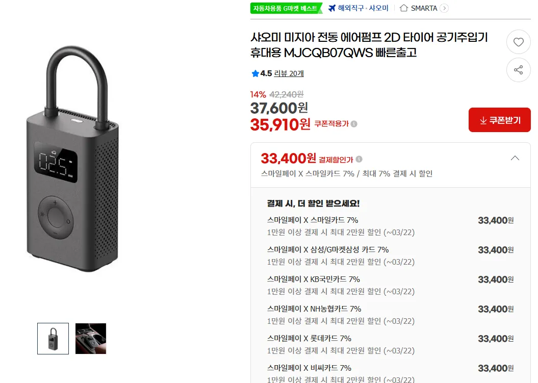 | G마켓 | 샤오미 미지아 전동 에어펌프 2D 타이어 휴대용 공기주입기 | 33,400원 | 핫딜모음에서 제공한 가격 |