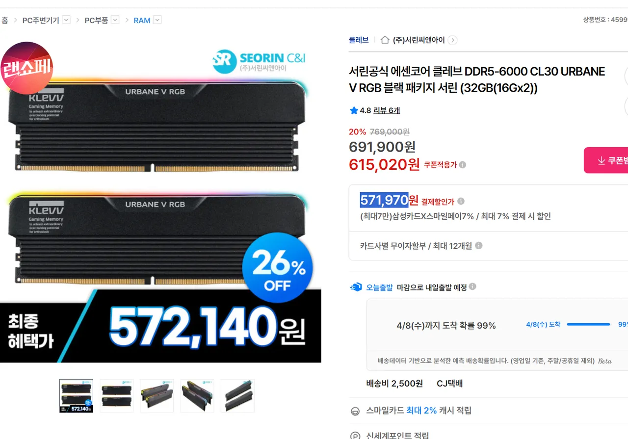 📦 서린공식 에센코어 클레브 DDR5-6000 CL30 URBANE V RGB 블랙 패키지 서린 (32GB(16Gx2))