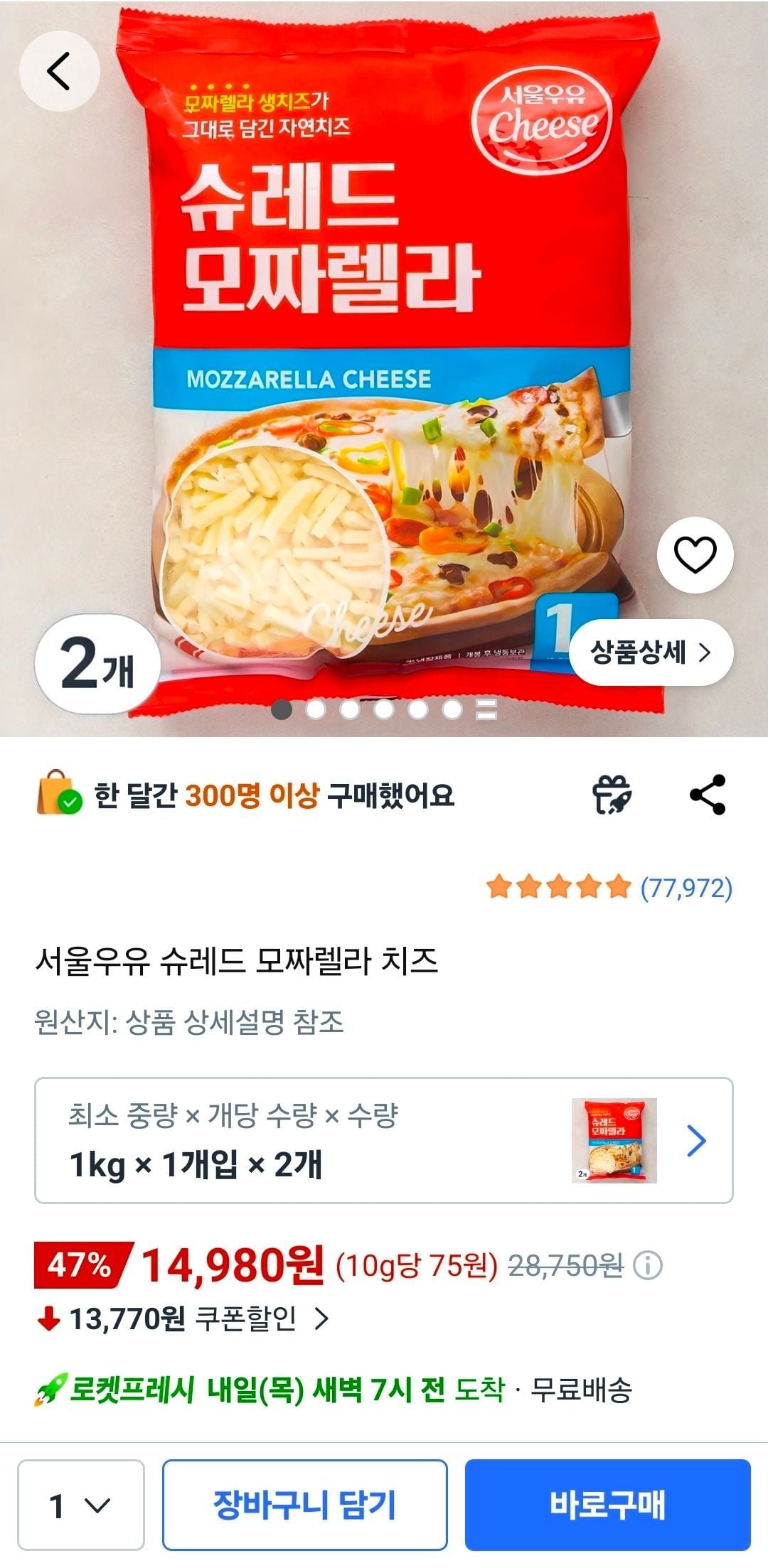 | 나100샵 | 서울우유 슈레드 모짜렐라 치즈 2kg | 15,850원 | 페이코 쿠폰 적용 가격 |
