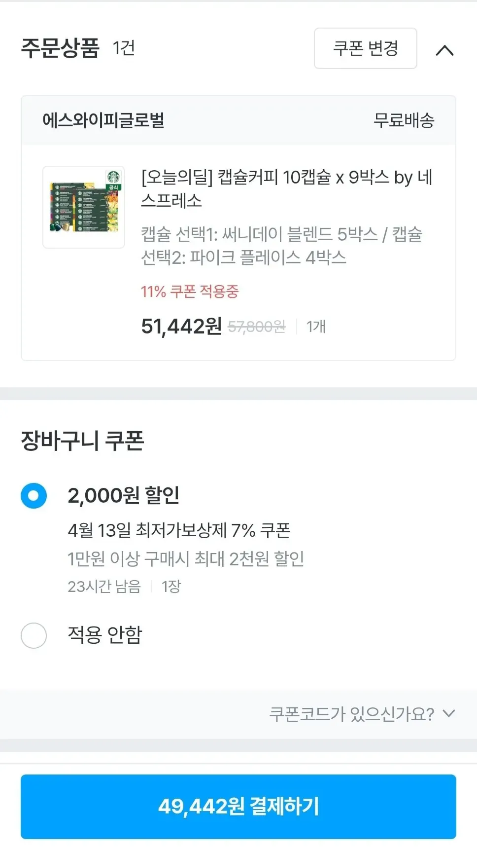 | coocha | 스타벅스 캡슐커피 by 네스프레소 3+3+3, 9BOX (90P) | 57,390원 | 9박스 90캡슐 동일, 쿠폰 적용 전 가격 |