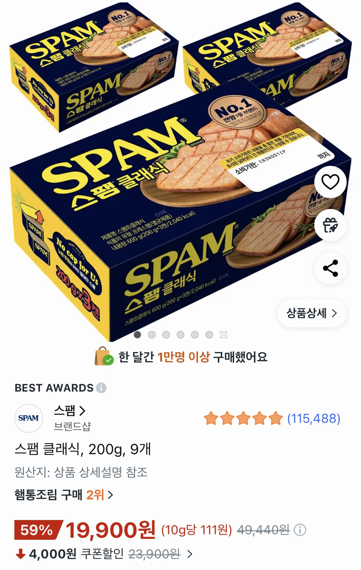 | 쿠팡 | 스팸 클래식 200g 9개 | 19,900원 | 핫딜모음에서 제공한 가격 |