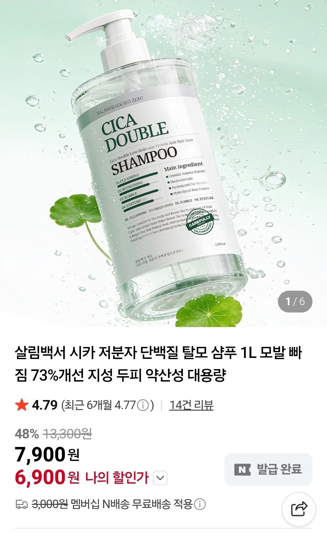 📦 시카 저분자 단백질 탈모 샴푸 1L