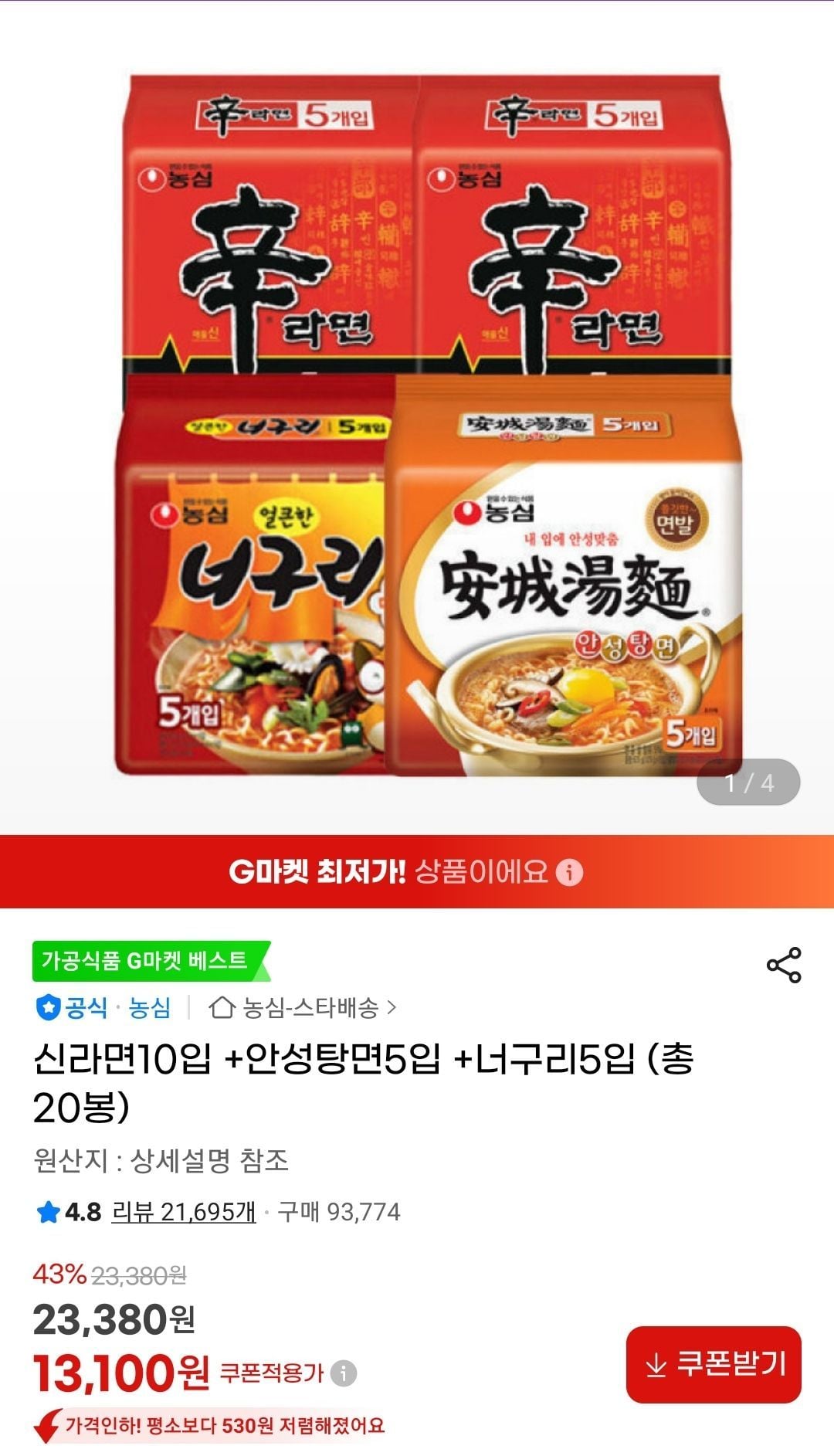 | 최저가마켓 | 신라면10입 +안성탕면5입 +너구리5입 (총 20봉) | 12,870원 | 쿠폰가, 스타배송 |