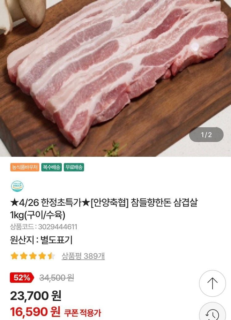 📦 [안양축협] 참들향한돈 삼겹살 1kg(구이/수육)