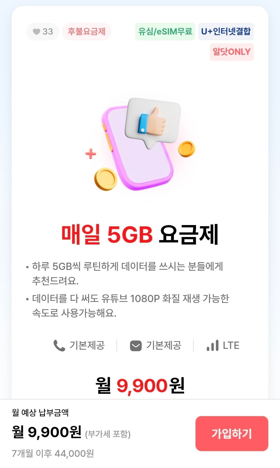 알닷에스원안심모바일 매일 5GB + 5Mbps 7개월 메뚜기 요금제9,900원핫딜모음핫딜모음에서 제공한 가격