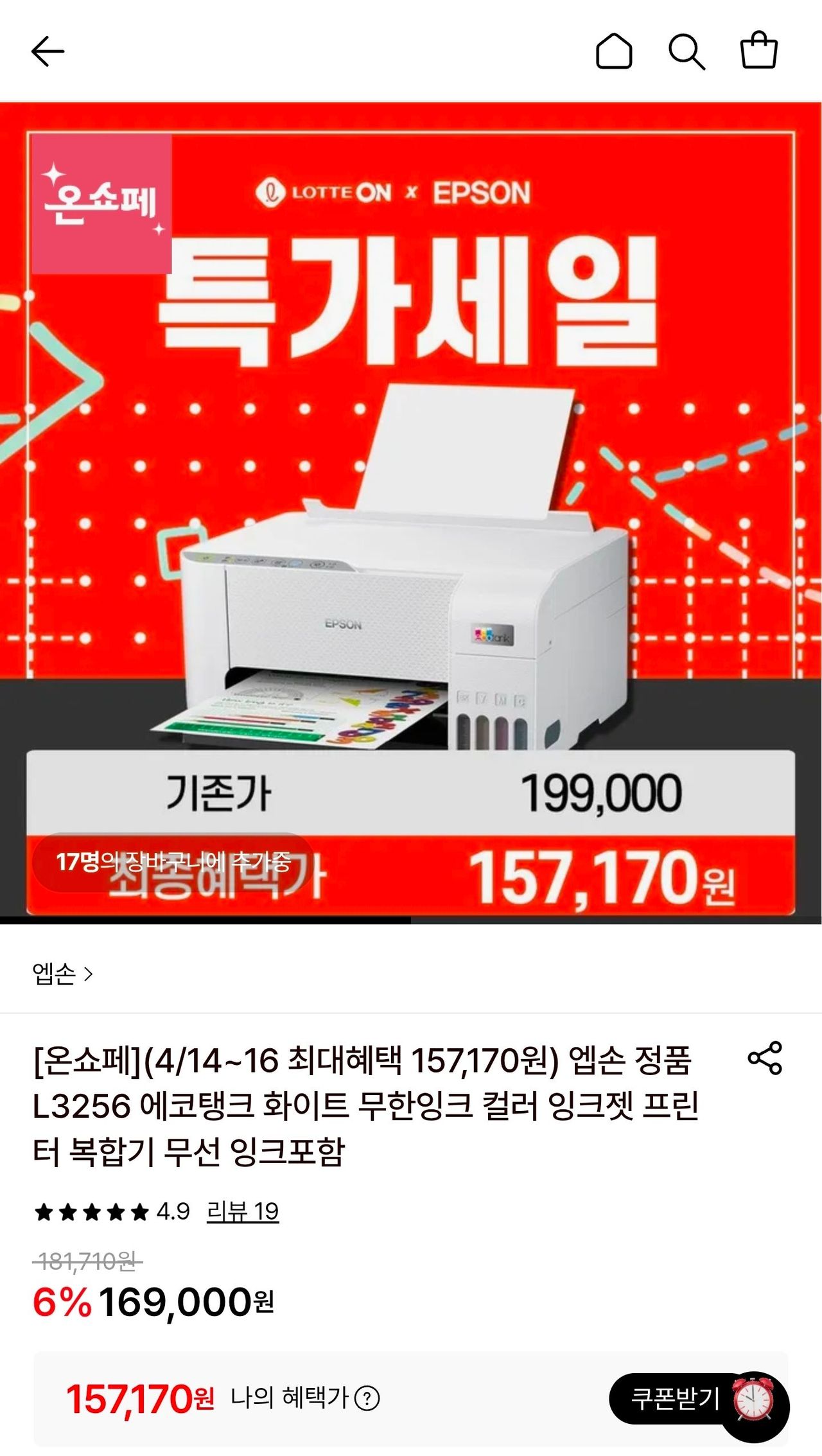 | 롯데온 | 엡손 L3256 에코탱크 화이트 컬러 잉크젯 복합기 | 157,170원 | 핫딜모음에서 제공한 가격 |