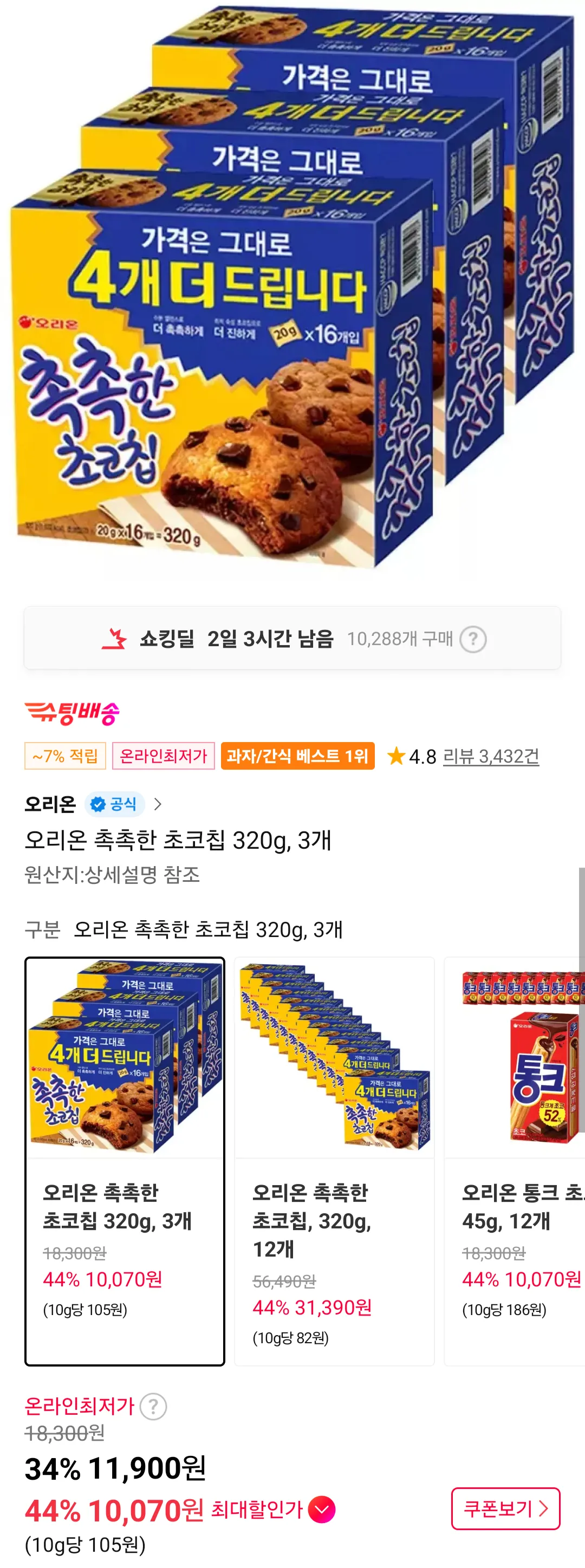📦 오리온 촉촉한 초코칩 320g, 3개 티멤버십
