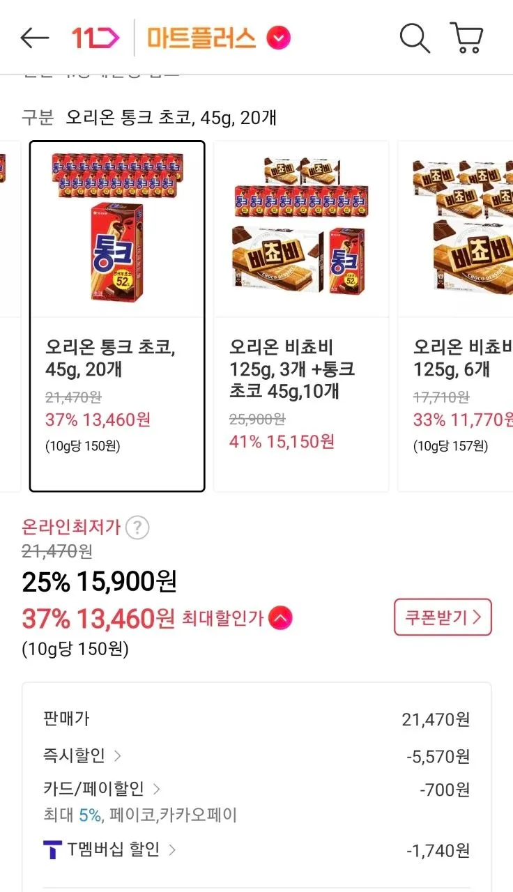 최저가마켓오리온 통크 초코 1P(45g) 20개14,670원삼성월렛 머니 결제 시 할인가